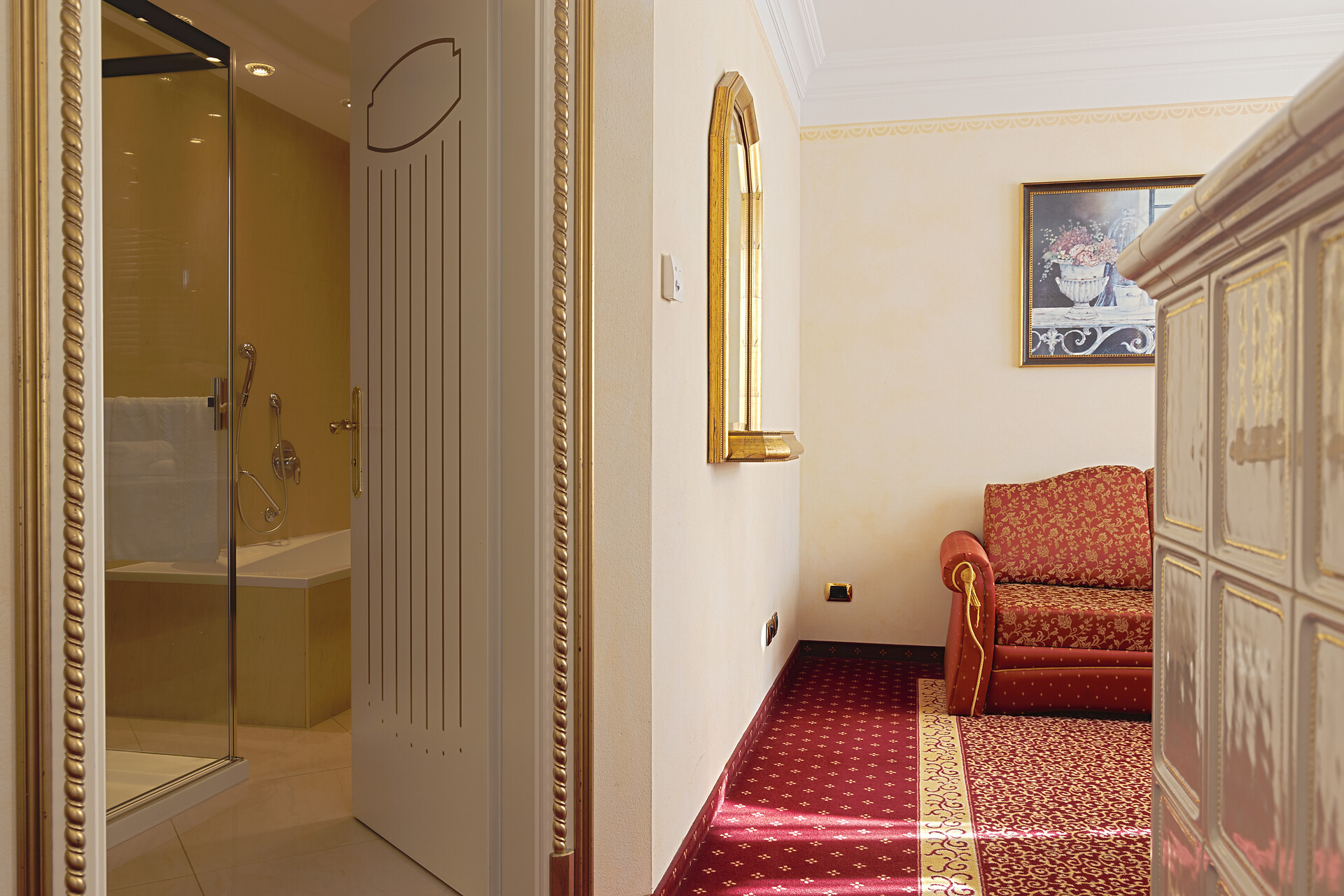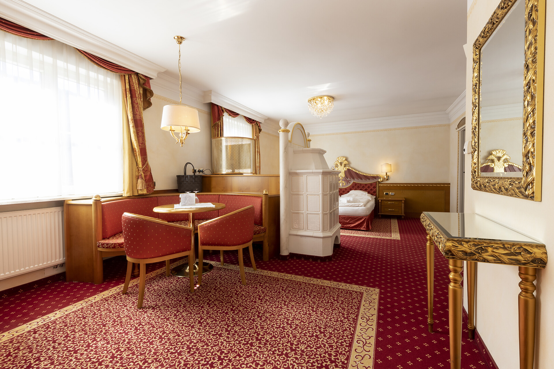 Großzügigkeit schafft Wohlbefinden, besonders in unseren geräumigen 45m² großen Juniorsuiten mit begehbarem Schrank und Kachelofen.