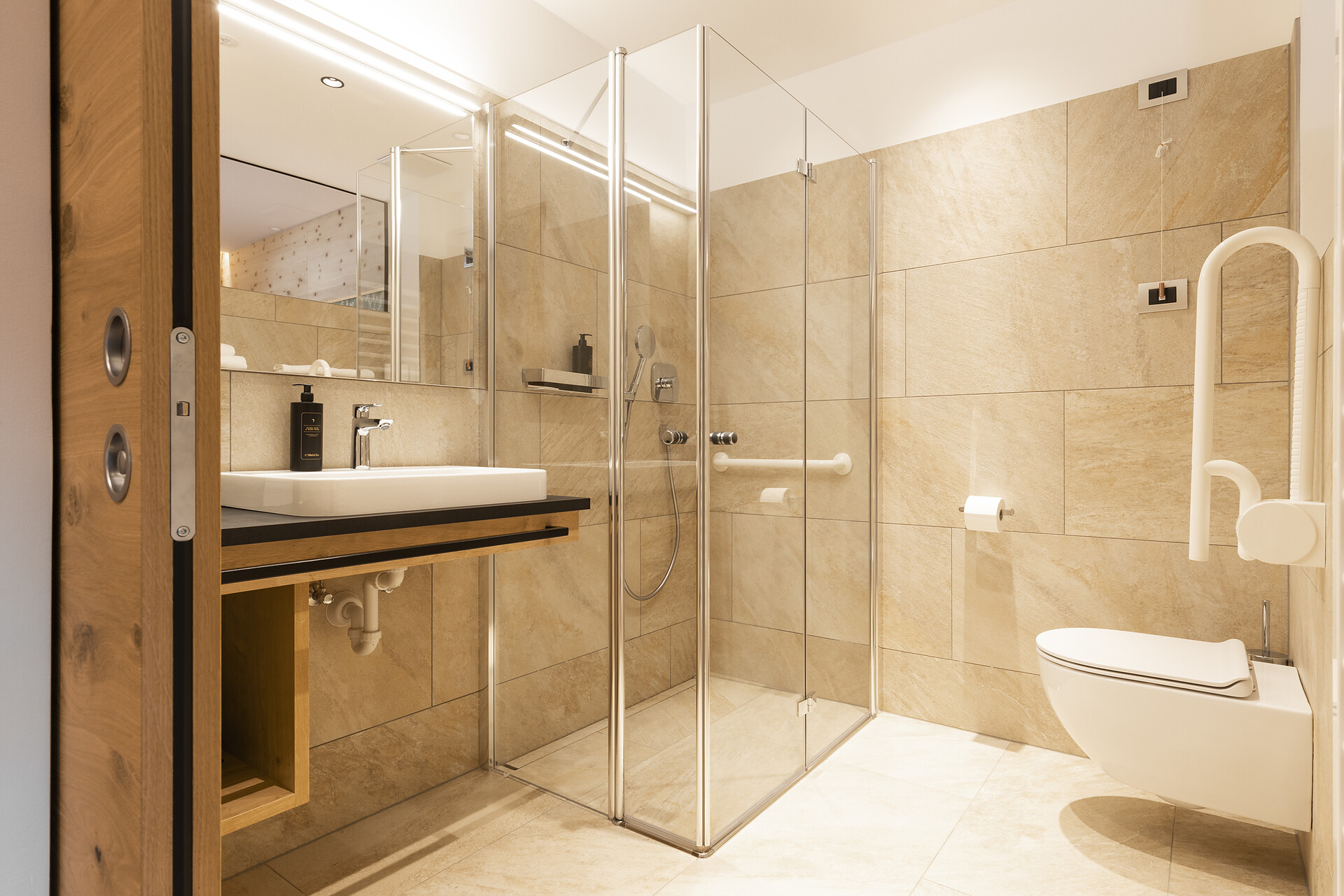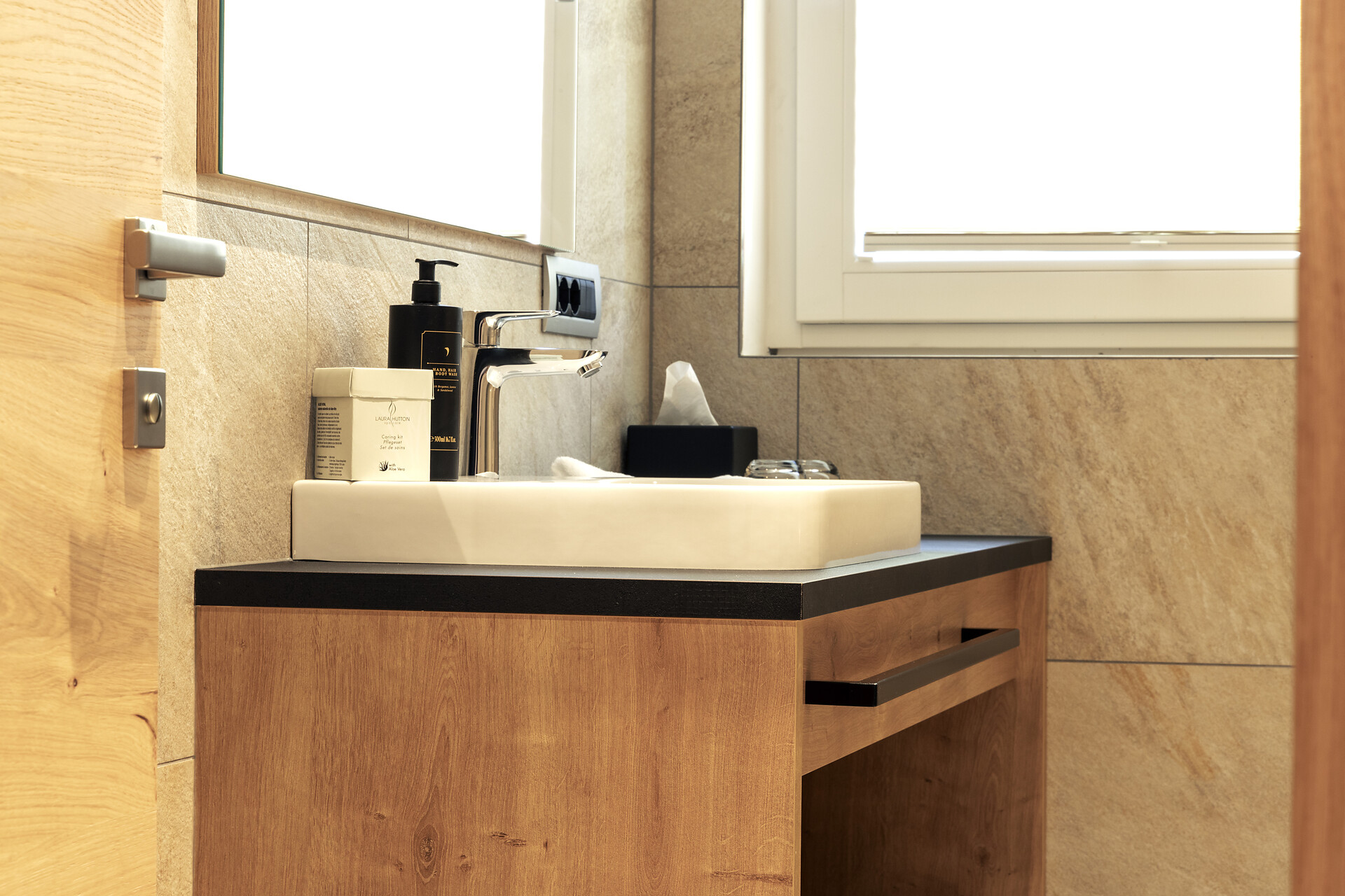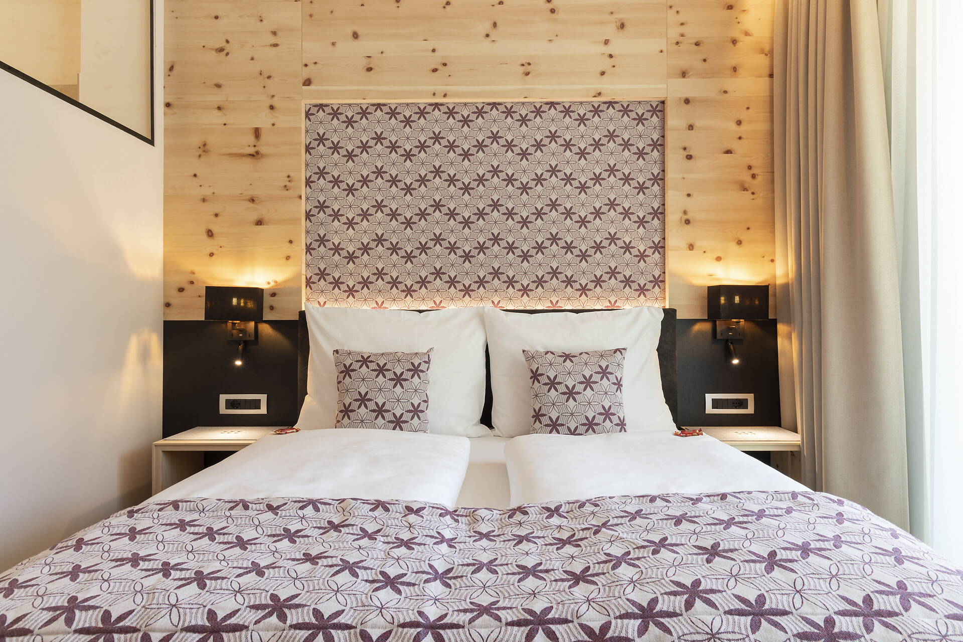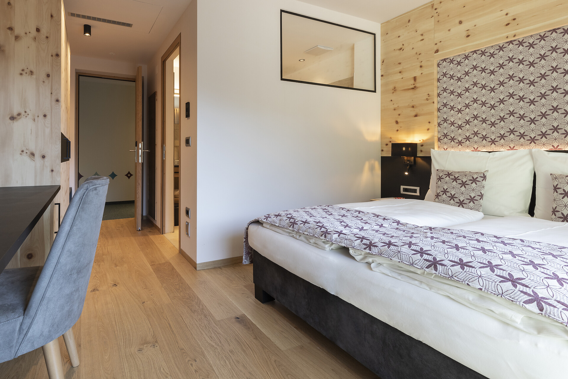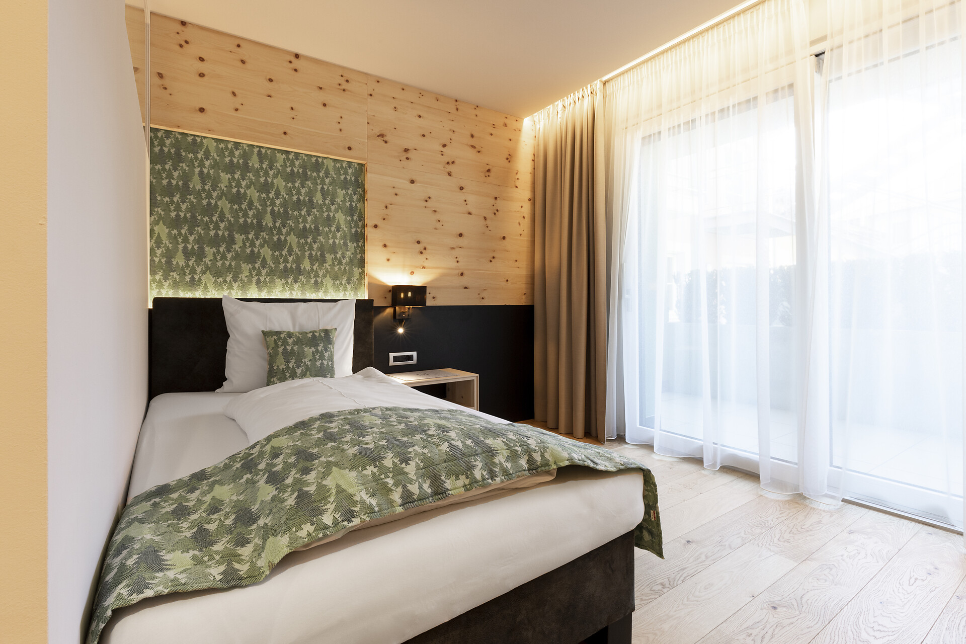 Das modern eingerichtete Familienzimmer ist mit 44m² äußerst geräumig und besteht aus 2 Schlafzimmern und einem Bad. Das Familienzimmer der Kategorie Superior "Adler" hat eine kleine Terrasse, mit Blick nach Villanders.