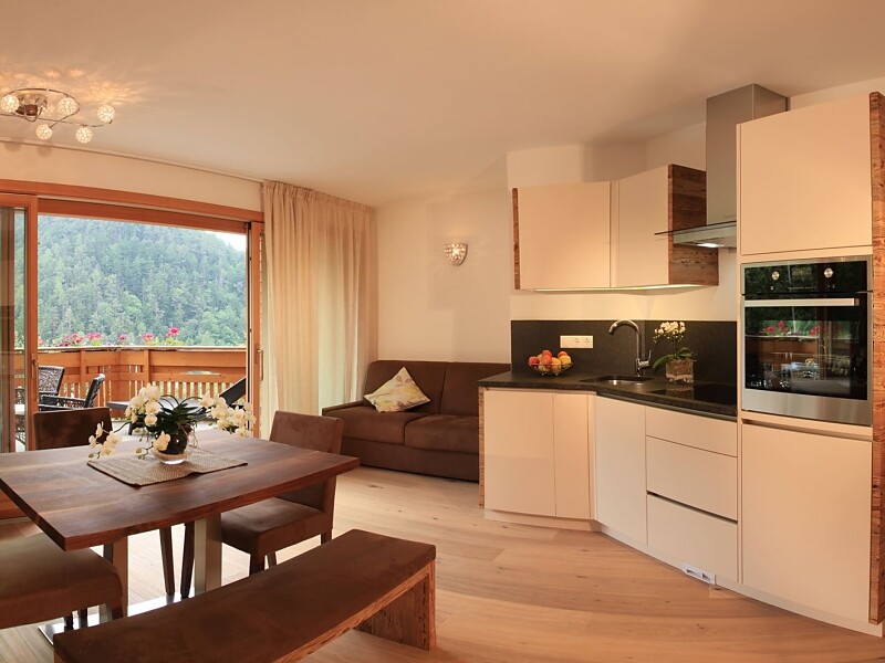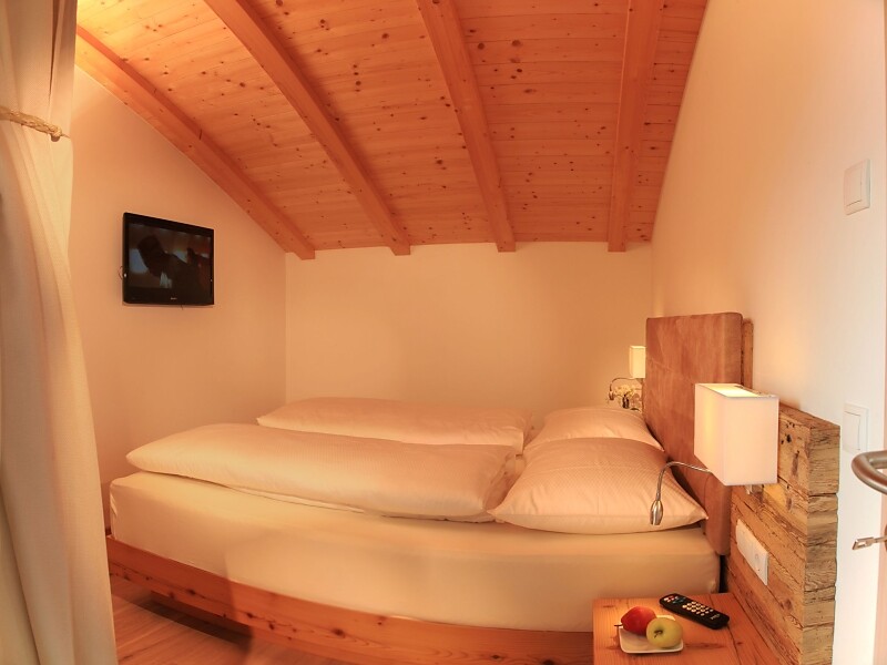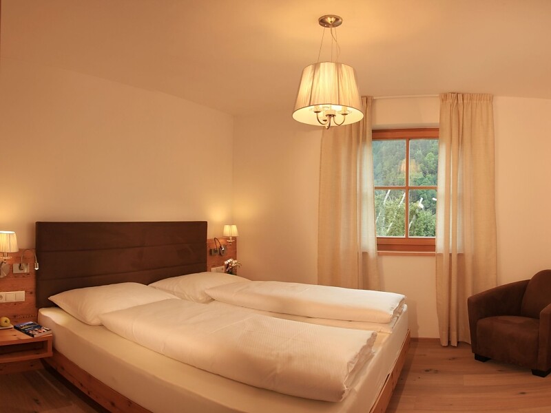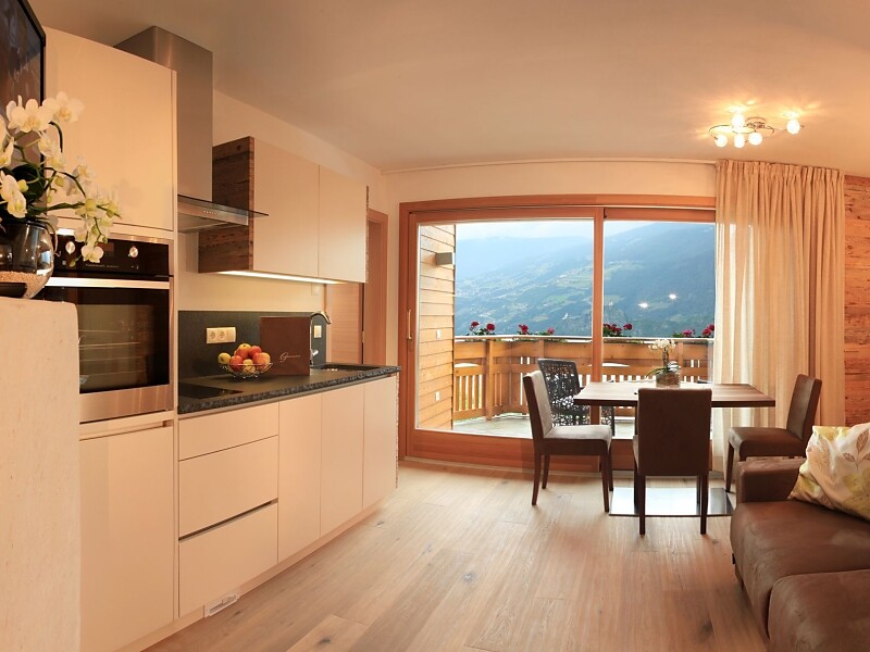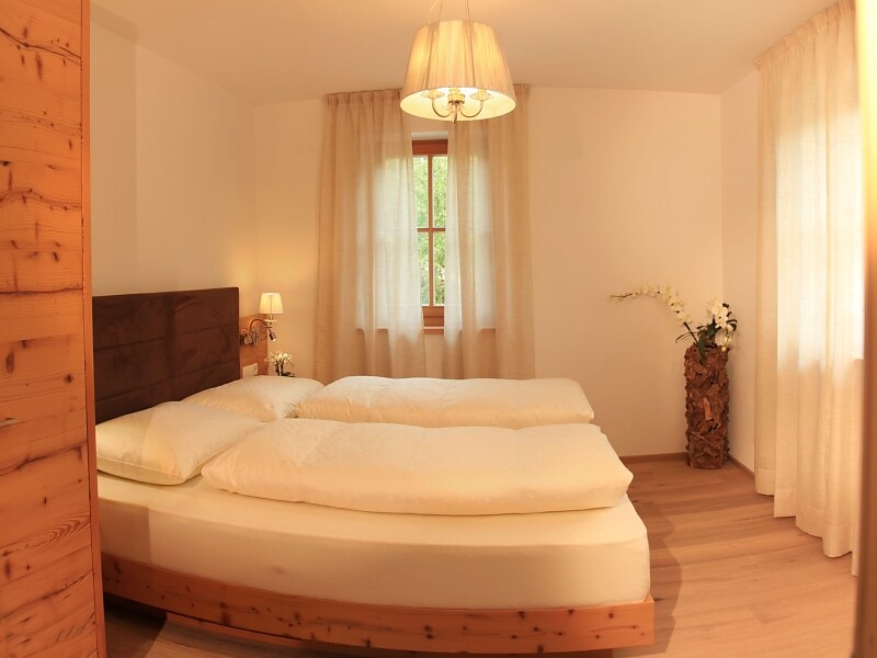 Sie verfügt über eine Kochnische mit Cerankochfeld, Backofen, Spülmaschine, Kühlschrank, Kaffeemaschine, Staubsaugeranlage, eine gemütliche Wohnsuite mit ausziehbarer Schlafcouch, offener Galerie mit Blick auf unsere Apfelanlage und direktem Zugang zur großen Terrasse. Ein Schlafzimmer mit Doppelbett und Badezimmer mit Badewanne, WC und Waschtisch sowie direktem Zugang zur Wohnsuite und zum Balkon. Ein zweites Schlafzimmer mit Doppelbett und Zugang zu Balkon und Badezimmer mit Dusche, WC, Bidet und Waschtisch.