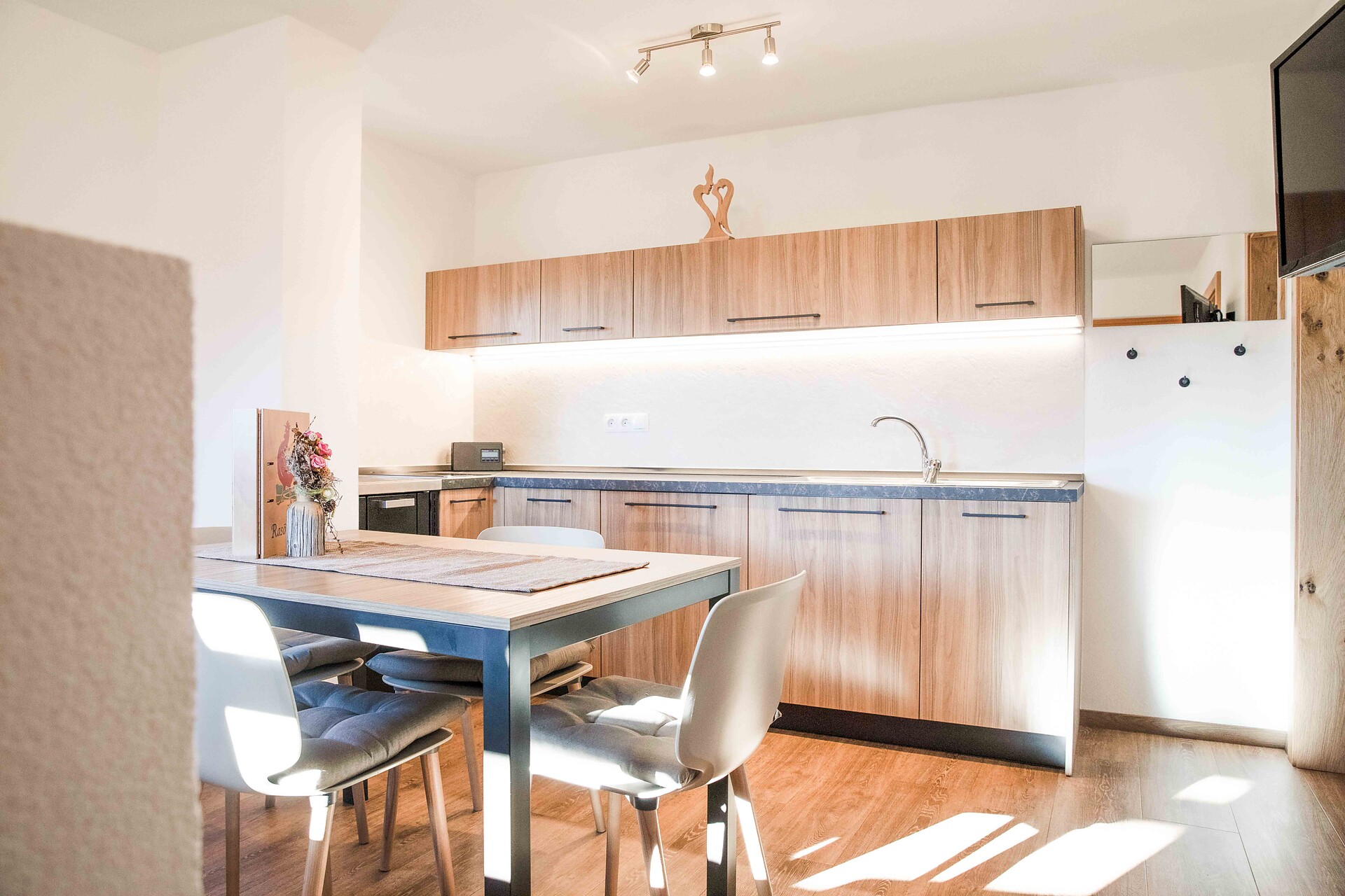 Dies ist eine unserer kleineren Ferienwohnungen, sie ist vollständig ausgestattet und bietet für 2 Personen Platz. Die Küche ist komplett eingerichtet und bietet genügend Platz, auch mal selbst zu kochen. Der eigene Sonnenbalkon lädt zum genießen ein. Nach einer langen Wanderung kann hier ordentlich entspannt werden.