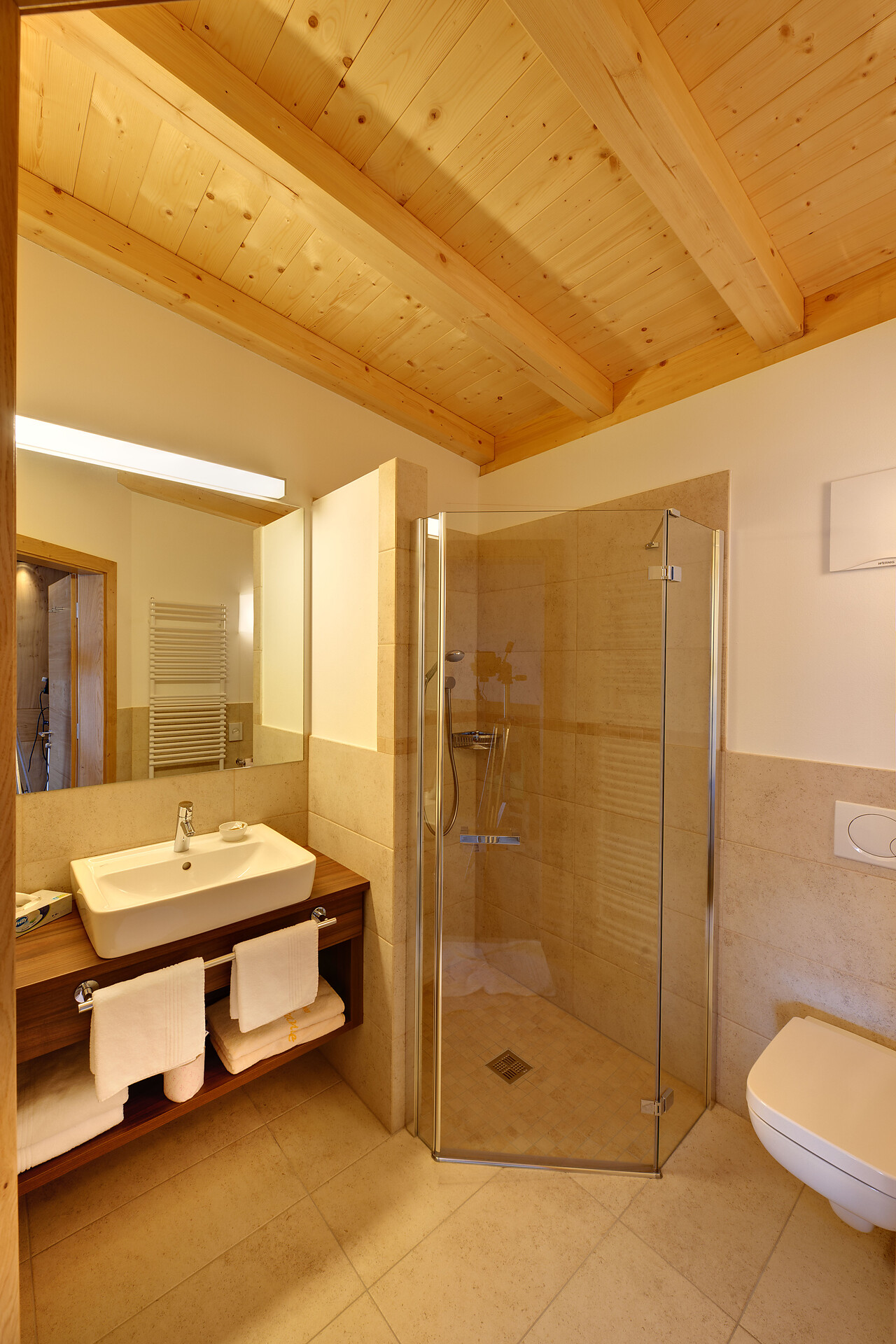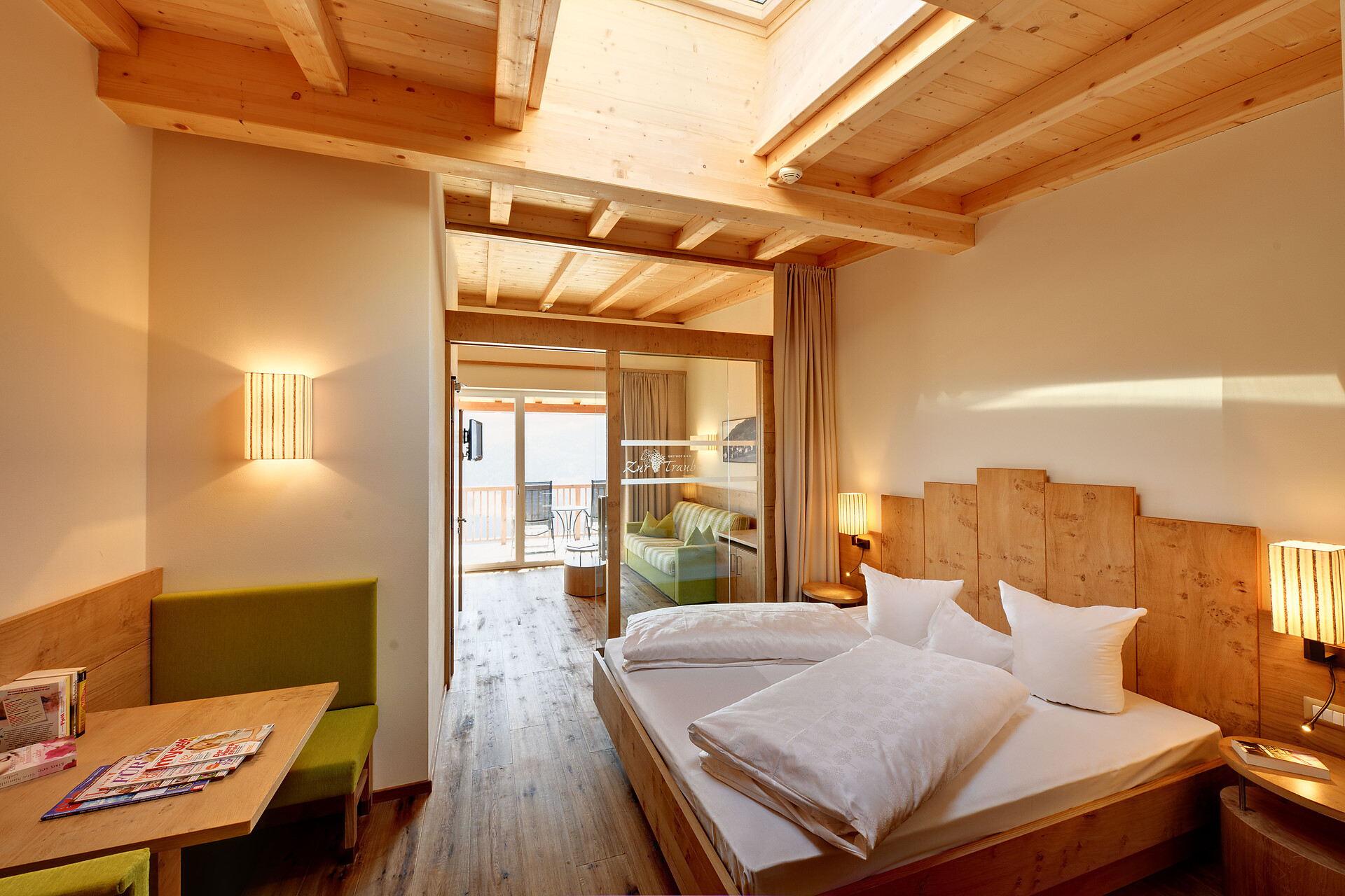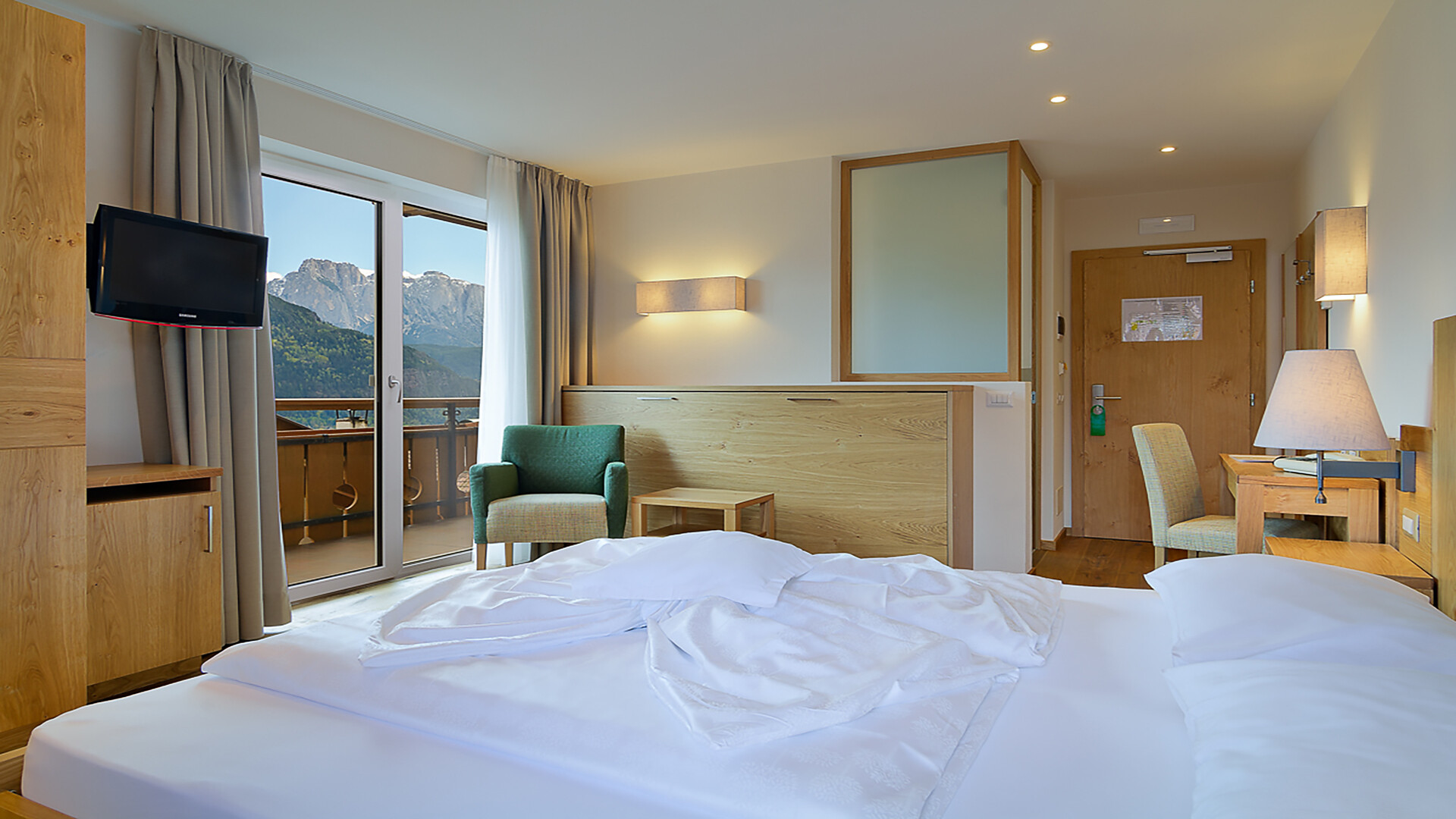 Suitezimmer für 2 - 4 Personen mit abgetrenntem Wohnbereich, Safe und wunderbarem Dolomitenblick. Suiten mit zwei Duschen, zwei WCs und Föhn.