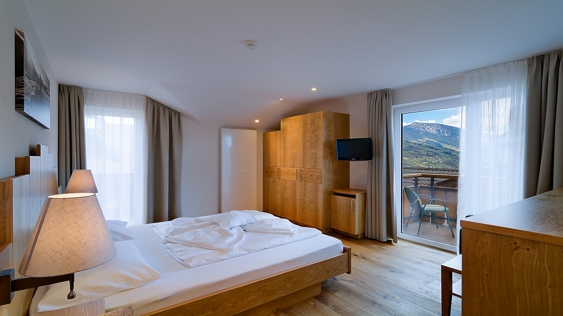 Ausstattung: Doppelzimmer, Doppelbett, Babybett, Bettsofa, Balkon, Wohnecke, Safe, Dusche / Bad, Haarfön, TV, Satellit/Kabel, Haupthaus, Panoramablick, Südseite