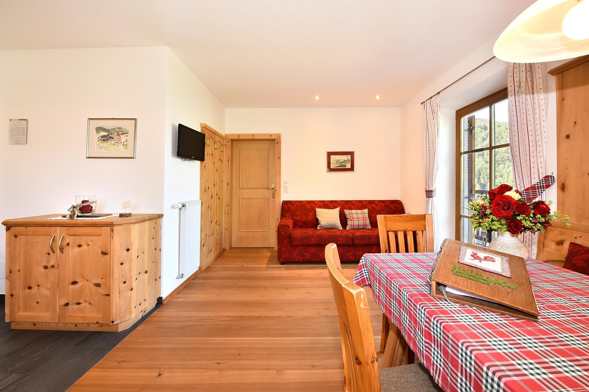 Die „Zirmstube“ besteht aus einem geräumigen, gemütlichen Schlafzimmer mit Himmelbett. Die große Wohnküche wurde aus Zirmholz gefertigt und verströmt einen heimeligen Wohlgeruch von Wärme und Gemütlichkeit.