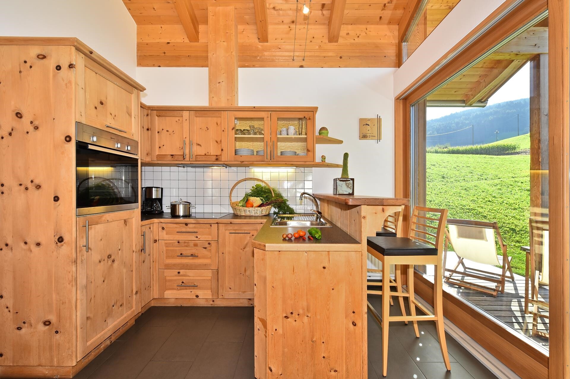 Die „Zirmstube“ besteht aus einem geräumigen, gemütlichen Schlafzimmer mit Himmelbett. Die große Wohnküche wurde aus Zirmholz gefertigt und verströmt einen heimeligen Wohlgeruch von Wärme und Gemütlichkeit.