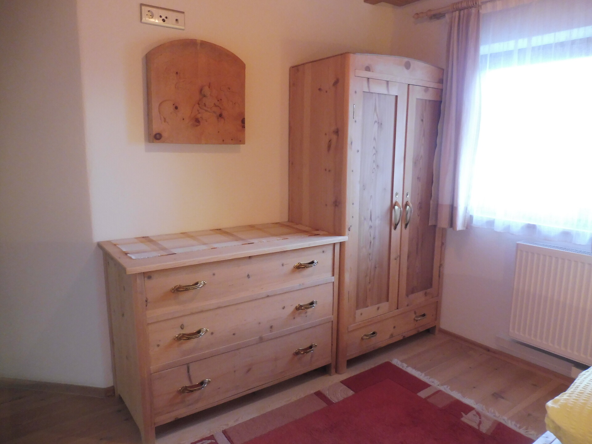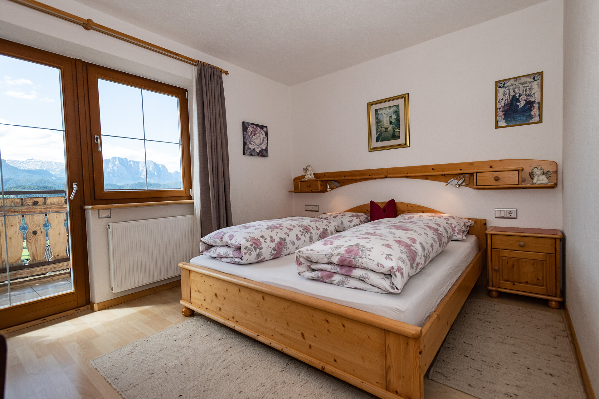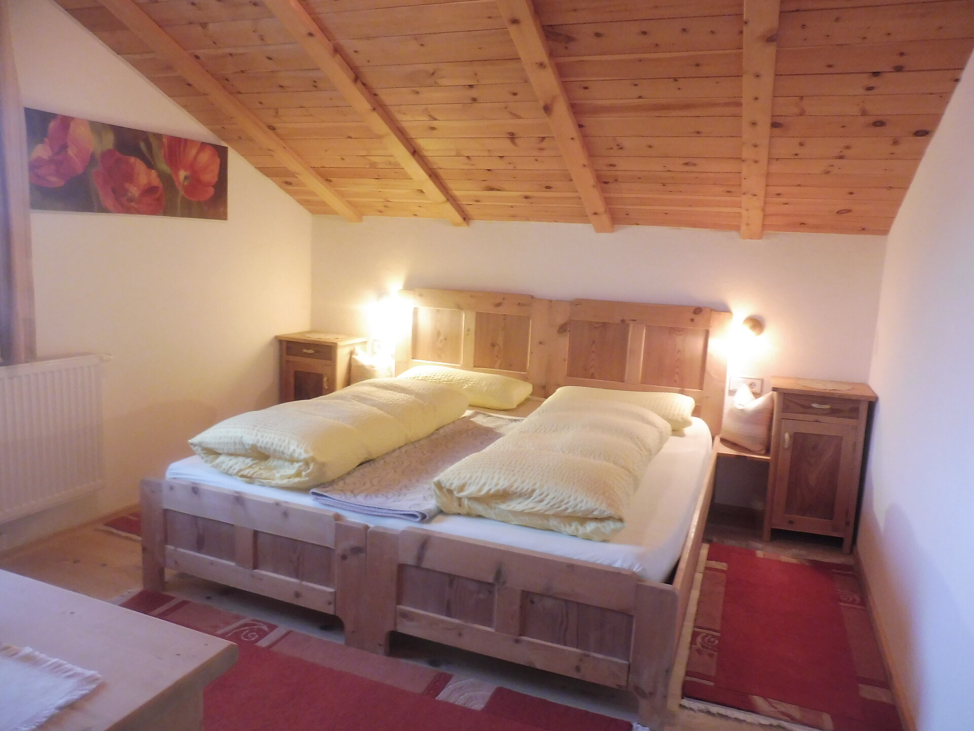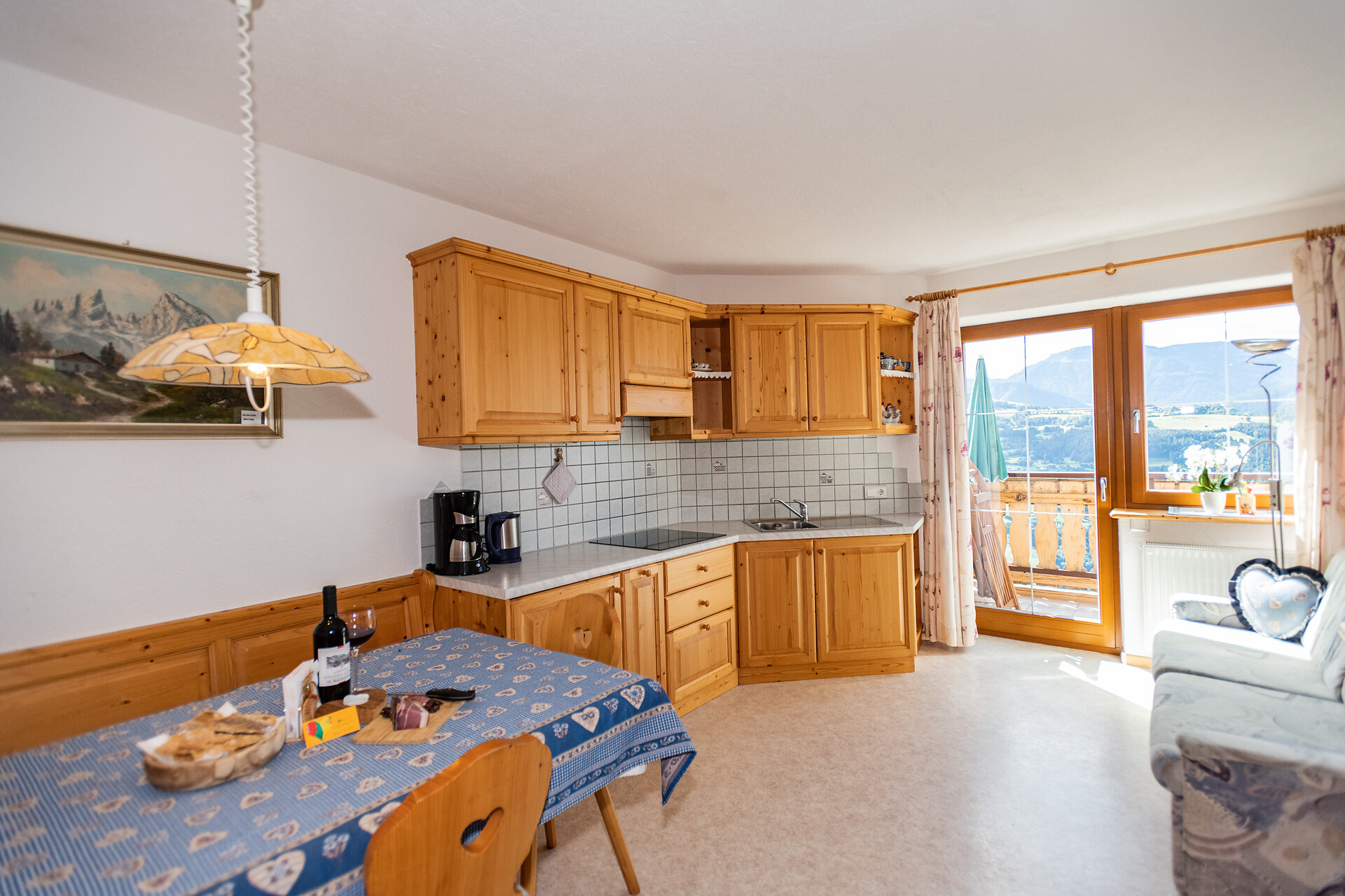 Unsere neu erbaute Ferienwohnung ist 55m² groß und hat einen Wohnraum mit ausziehbarer Couch und integrierter Küche, ein Kinderzimmer mit französischen Bett ,Dusche/WC und ein weiteres Doppelbettzimmer mit dem Badezimmer daneben. Die Küche hat ein Ceranfeld mit vier Kochmöglichkeiten, Kühlschrank, Kaffeemaschine, Mikrowelle, Toaster, Eierkocher. Wir stellen die gesamte Bettwäsche, die Handtücher, die Küchentücher und auch den Bademantel. Die Wohnungen sind mit Massivmöbel ausgestattet und sehr gemütlich und heimelig eingerichtet. Sat-TV, Radio, Haarföhn vervollständigen das Angebot. Auf Wunsch beliefern wir Sie täglich mit frischen Brötchen vom Bäcker und hofeigenen Produkten wie Milch, Eier, Wein, Speck, Marmeladen, Säfte, Gemüse, Beerenobst, Kastanien.