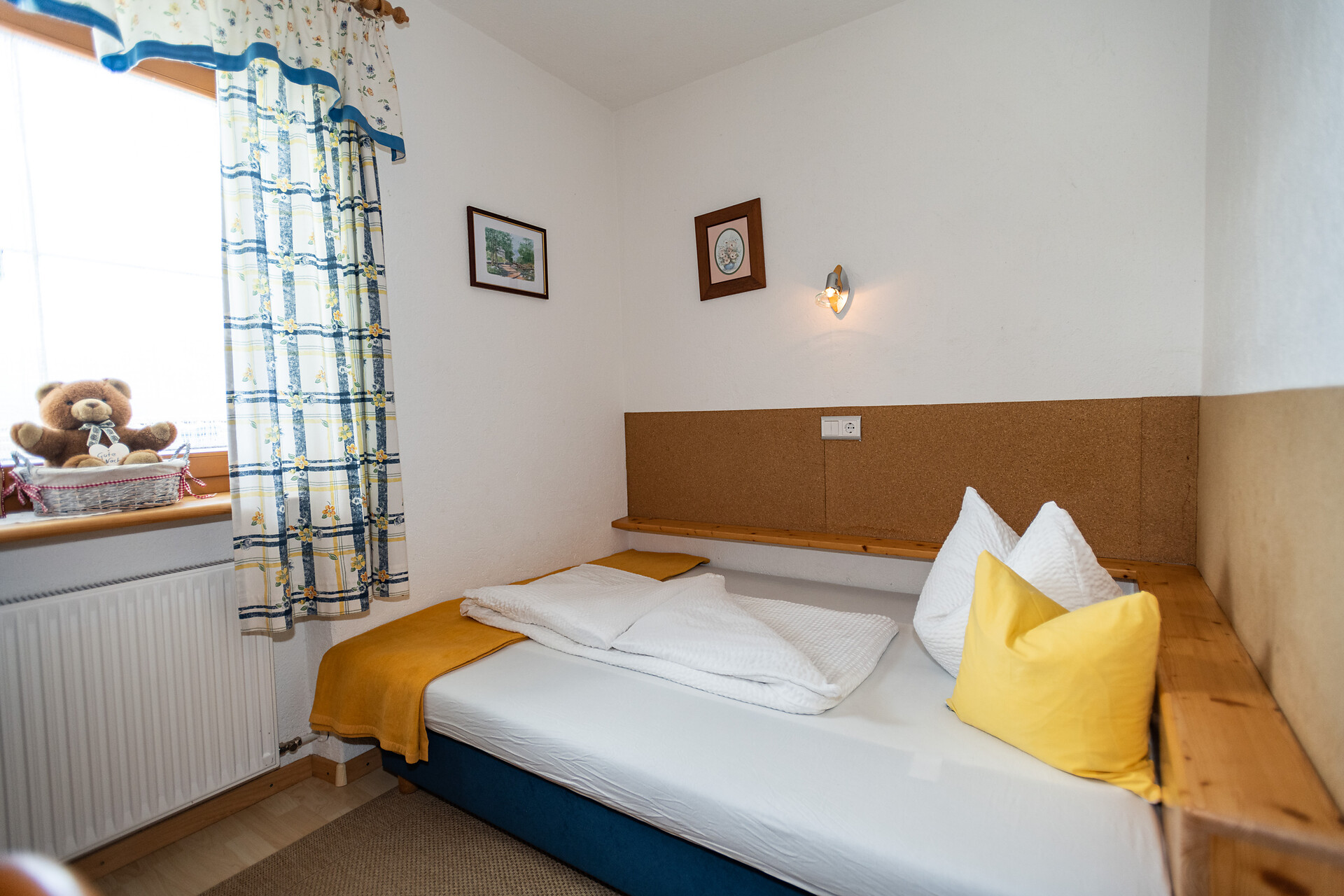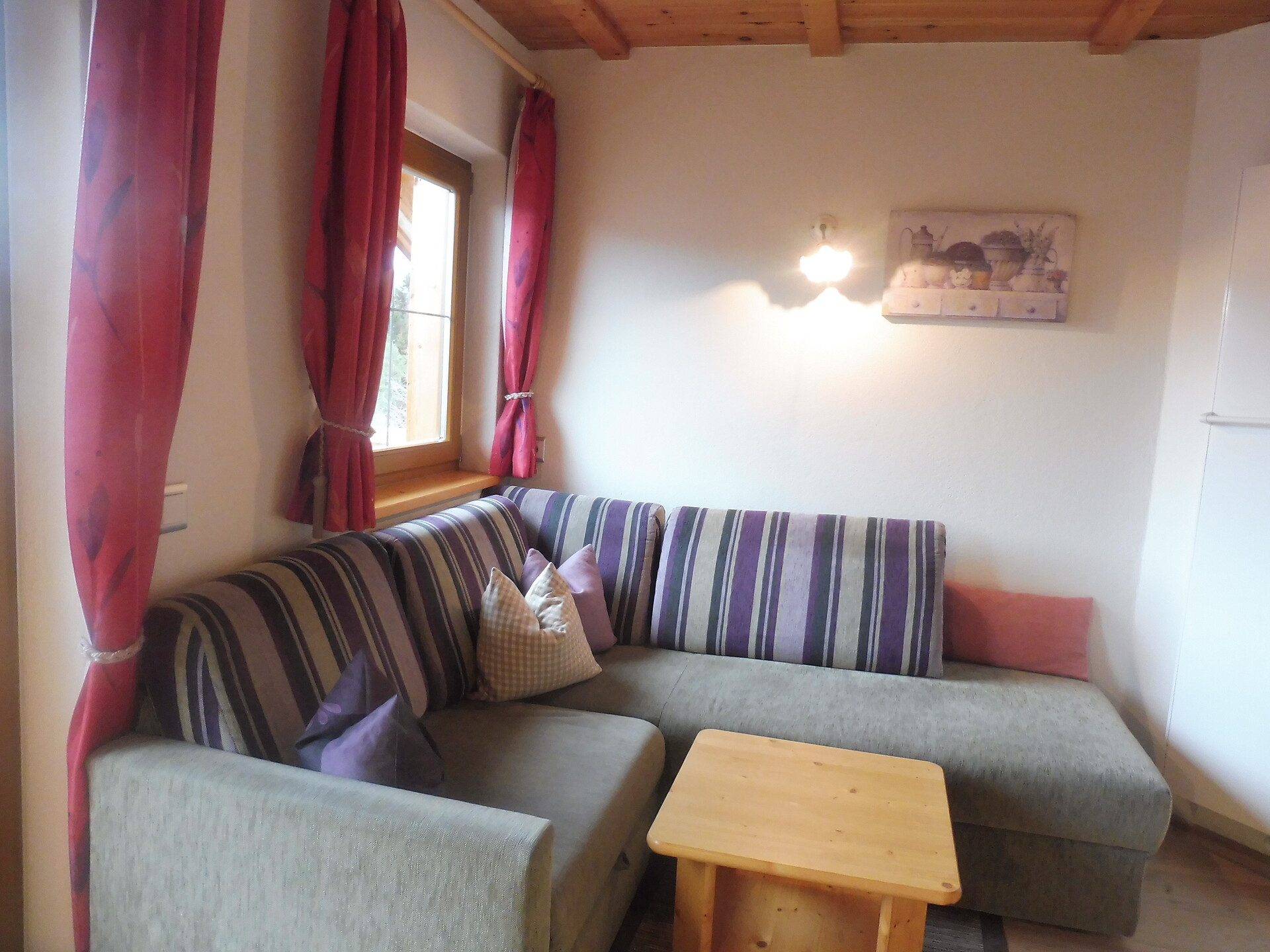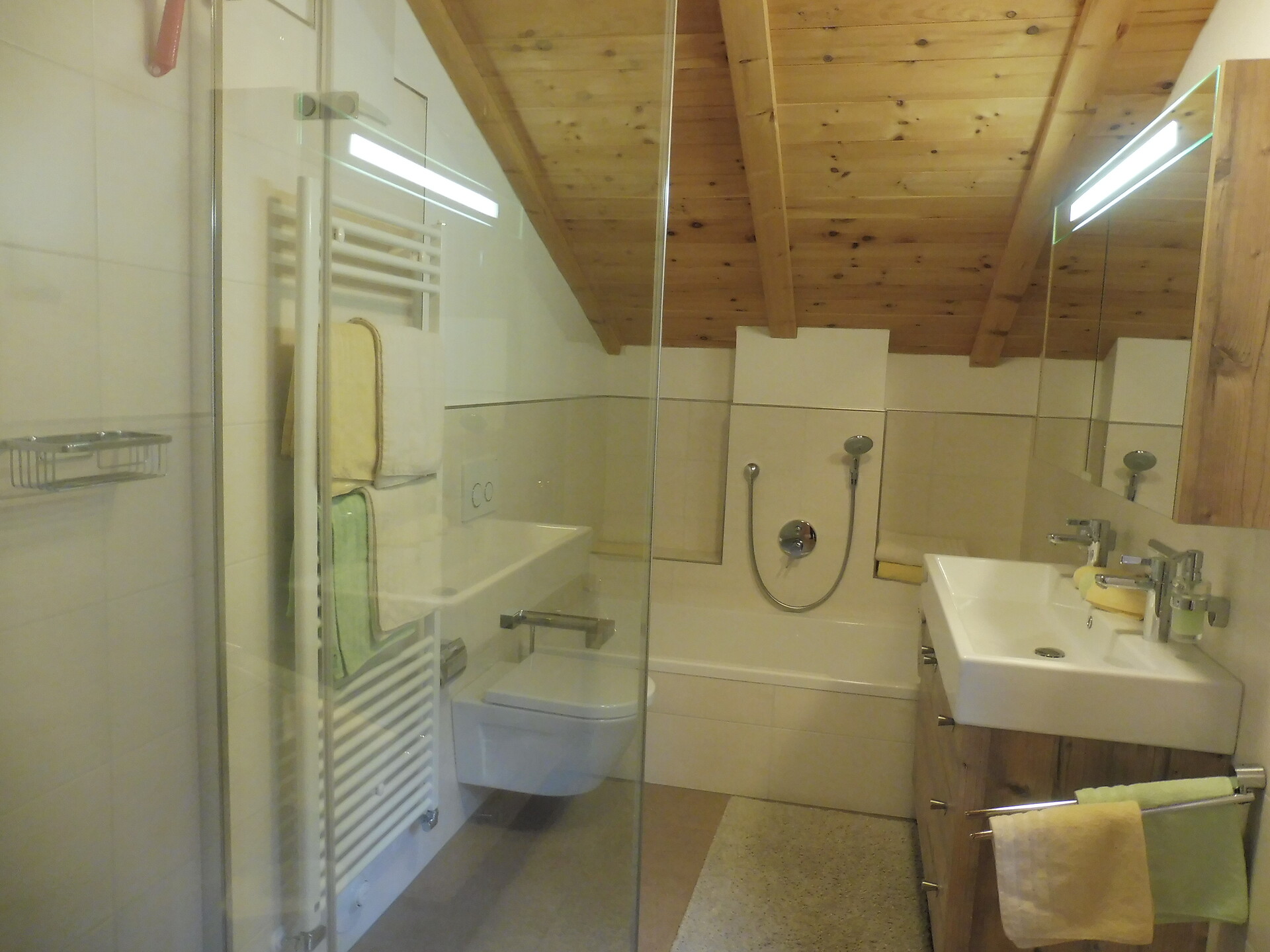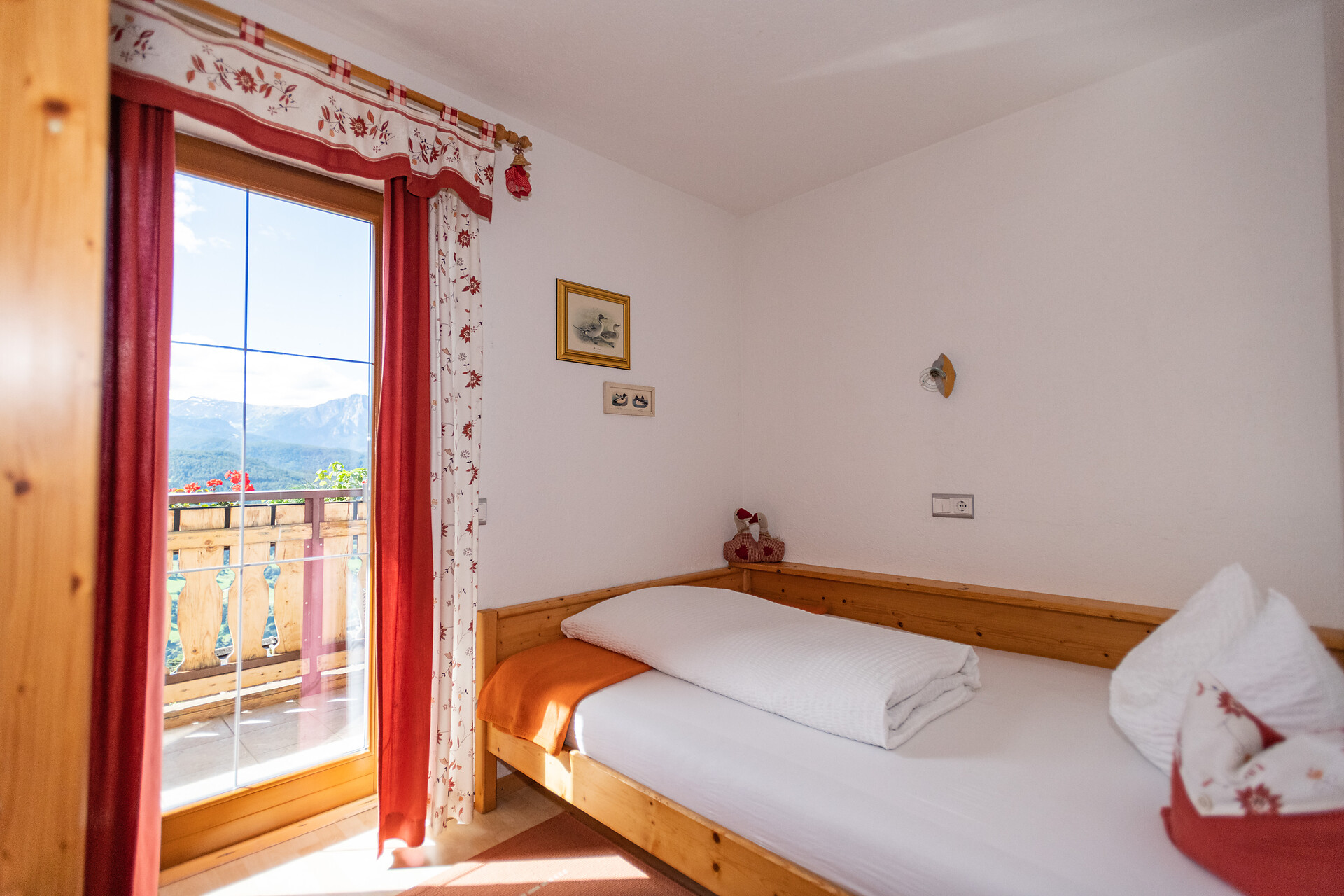 Unsere neu erbaute Ferienwohnung ist 55m² groß und hat einen Wohnraum mit ausziehbarer Couch und integrierter Küche, ein Kinderzimmer mit französischen Bett ,Dusche/WC und ein weiteres Doppelbettzimmer mit dem Badezimmer daneben. Die Küche hat ein Ceranfeld mit vier Kochmöglichkeiten, Kühlschrank, Kaffeemaschine, Mikrowelle, Toaster, Eierkocher. Wir stellen die gesamte Bettwäsche, die Handtücher, die Küchentücher und auch den Bademantel. Die Wohnungen sind mit Massivmöbel ausgestattet und sehr gemütlich und heimelig eingerichtet. Sat-TV, Radio, Haarföhn vervollständigen das Angebot. Auf Wunsch beliefern wir Sie täglich mit frischen Brötchen vom Bäcker und hofeigenen Produkten wie Milch, Eier, Wein, Speck, Marmeladen, Säfte, Gemüse, Beerenobst, Kastanien.